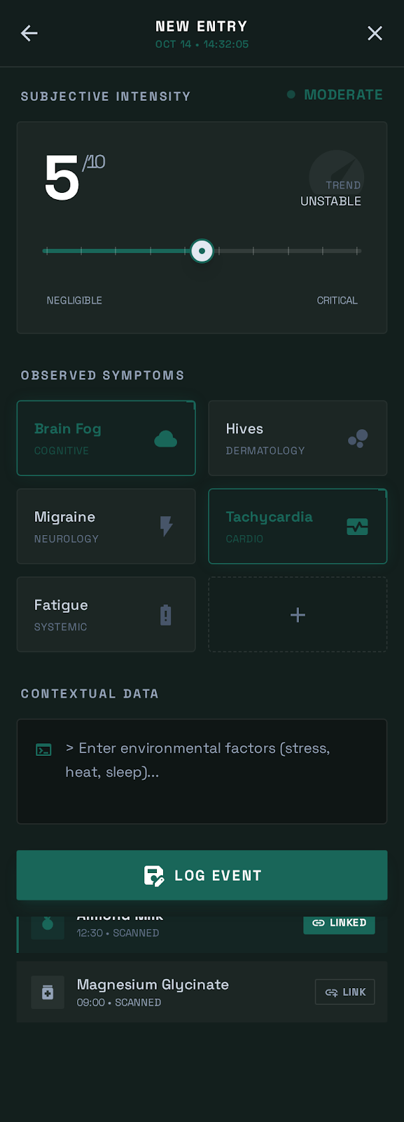 The Mission: To build a comprehensive "Health Intelligence" system that tracks the intersection of environmental triggers (food, chemical, beauty, environment) and daily symptom baselines to provide AI-driven pattern recognition for patients and their doctors to use as supporting evidence for a diagnosis.