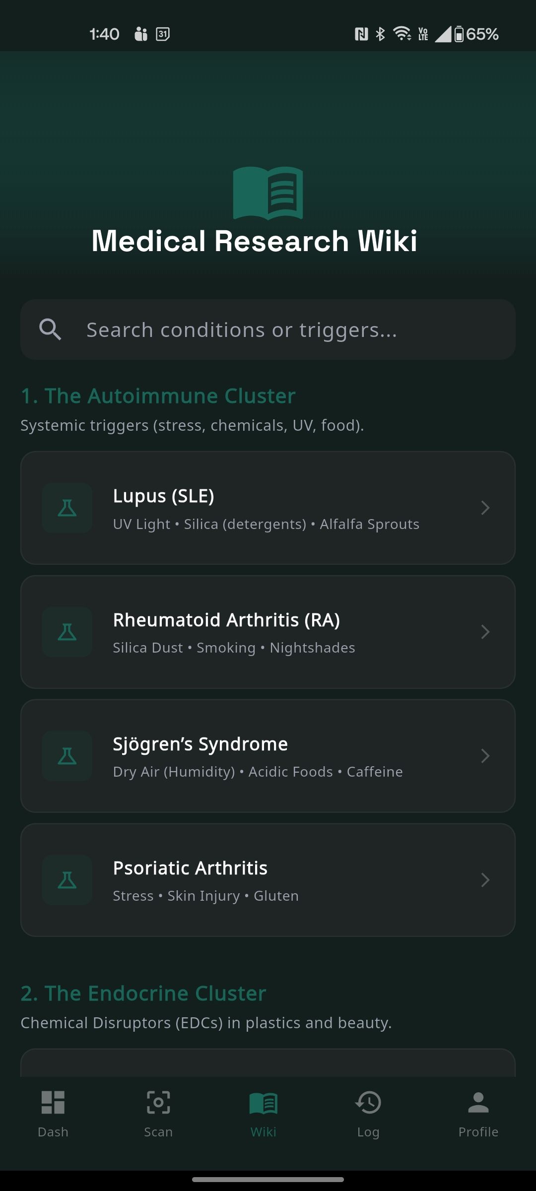 - The UX Logic: Education is the first step in symptom reduction. By placing the Wiki alongside the tracker, the app moves the user from "Crisis Management" to "Proactive Prevention." I believe the more educated you are, the better equipped you are towards a recovery or at least a better quality of life.