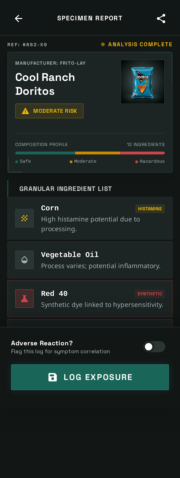 - The Decision: I created a logic flow where the AI cross-references the frequency of specific ingredients against the onset of logged symptoms. It takes into account the symptoms logged in the user's diary for the last 72 hours to determine the chance of an existing flare-up. As you continue to log more data points, in theory, it gets smarter at detecting new triggers.